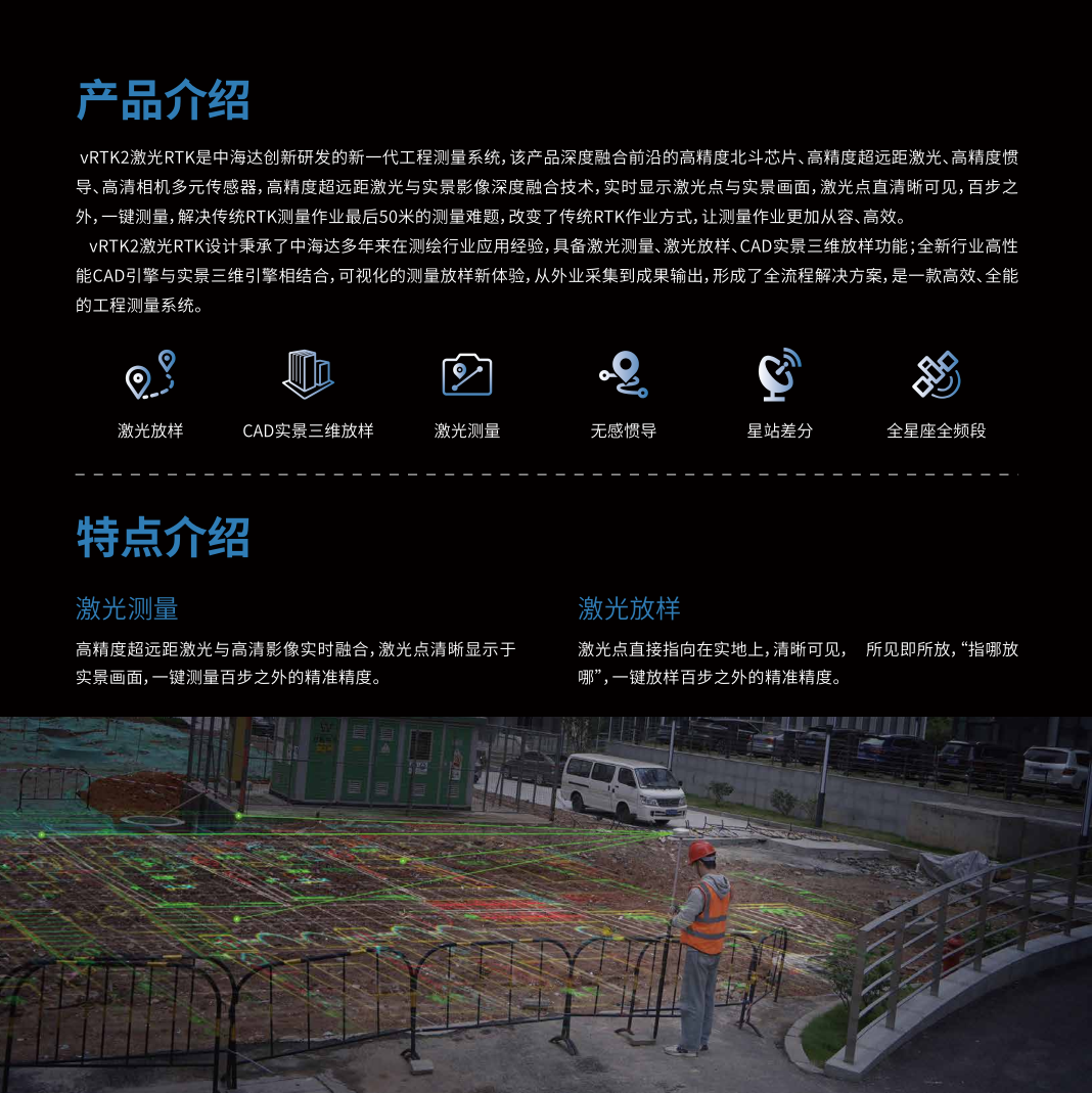 vRTK2激光RTK是中海达创新研发的新一代工程测量系统,该产品深度融合前沿的高精度北斗芯片、高精度超远距激光、高精度惯